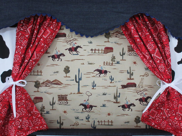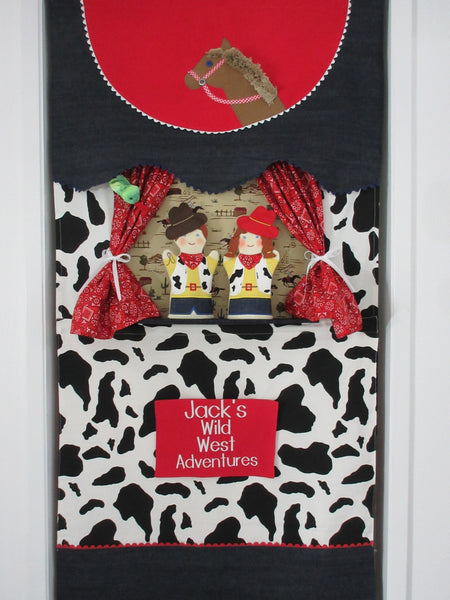 Personalize your doorway puppet theater by adding your text above. Please type out exactly what you would like your name plaque to say in the box. Select the number of words at the top of the page and click "add to cart".